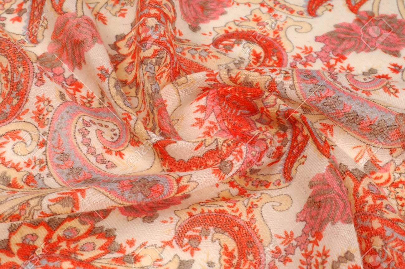 Textura, Padrão, Plano De Fundo. Tela De Seda - Paisley Em Um Fundo Bege. Esta Impressão De Borda De Seda Bonita Tem Paisley E Estampa Floral Em Laranja E Cinza Em Um